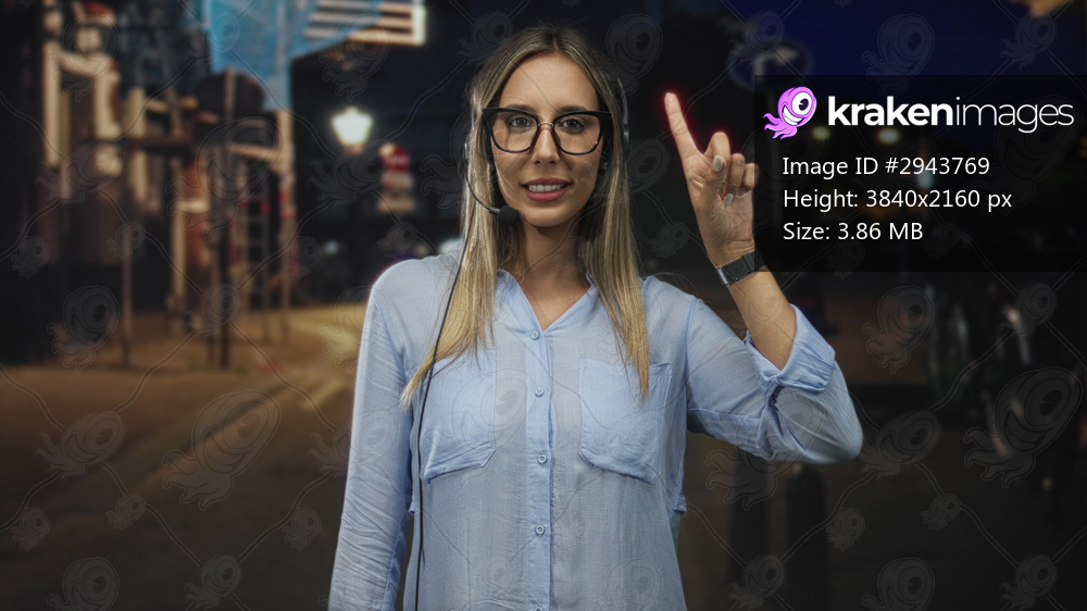 Young woman with headset points finger upward on city street late night; customer support confidence.