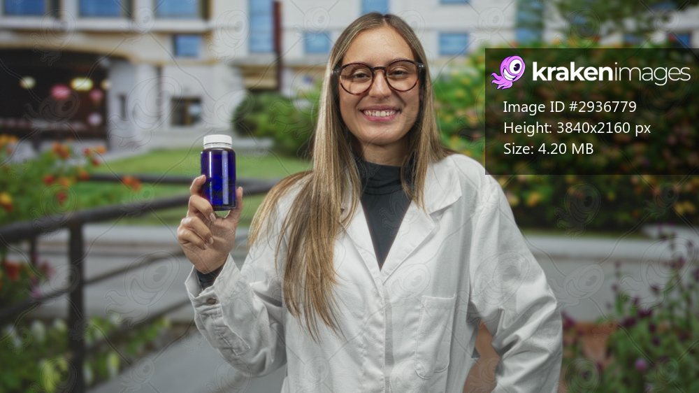 Young woman holding a blue bottle outside a medical building while smiling and wearing a lab coat; confidence wellness trust.