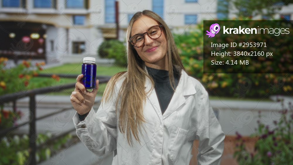 Young woman holding a blue bottle outside a medical building while smiling and wearing a lab coat; confidence wellness trust.