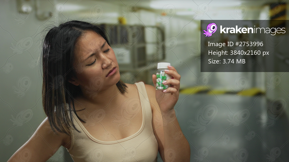 Young woman holding a bottle of pills inside a cruise ship, looking concerned in a blurry hallway setting on the sea.
