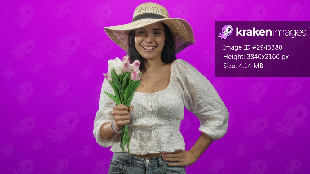 Young woman holding a bouquet of tulips in a studio, wearing a sunhat and white blouse with jeans; spring joy.