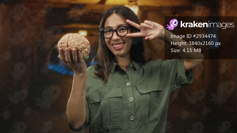 Young woman holding a brain model with outstretched hand and making a two finger peace sign by her eye in an old building; playful curiosity wonder.