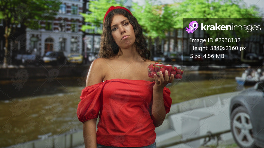 Young woman holding a clear container of strawberries by a canal street, exposed shoulders and hand holding fruit; joy.