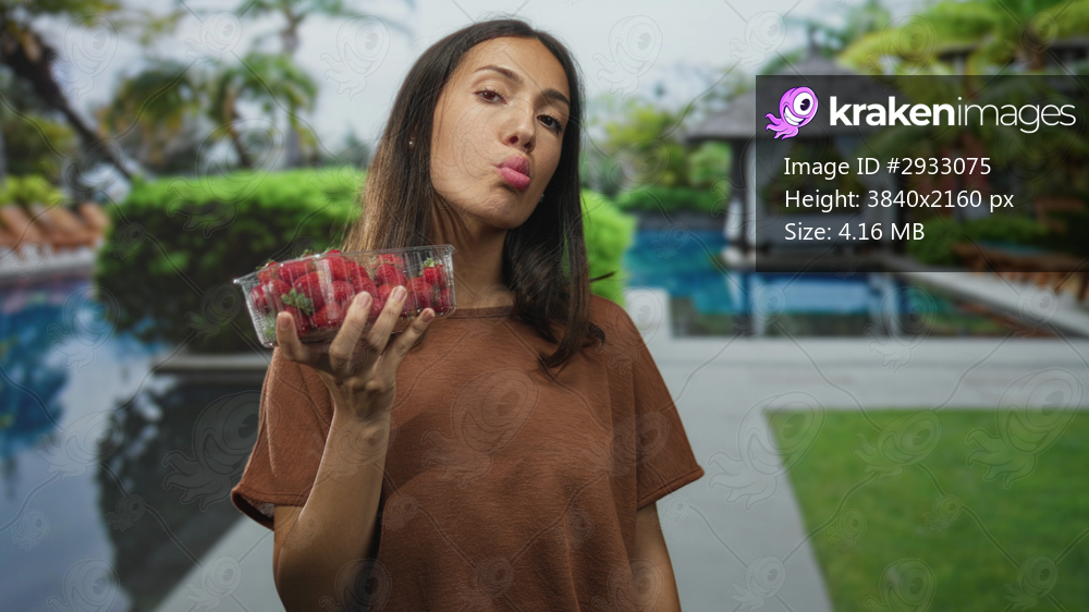 Young woman holding a clear container of strawberries by the hotel pool resort, offering fruit to camera with a smile; summer joy.