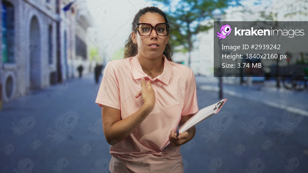 Young woman holding a clipboard touches her chest with one hand in a puzzled gesture while standing on a pedestrian street near buildings; uncertainty. - Kraken Images
