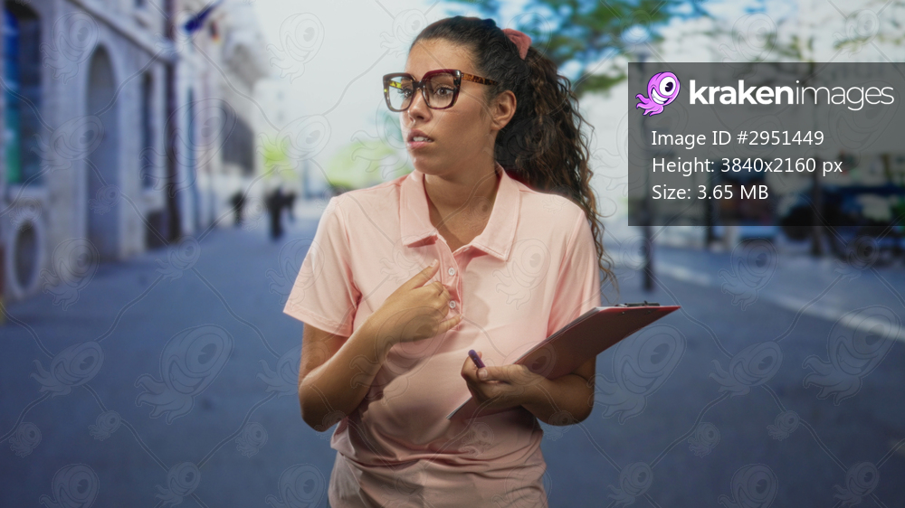 Young woman holding a clipboard touches her chest with one hand in a puzzled gesture while standing on a pedestrian street near buildings; uncertainty. - Kraken Images