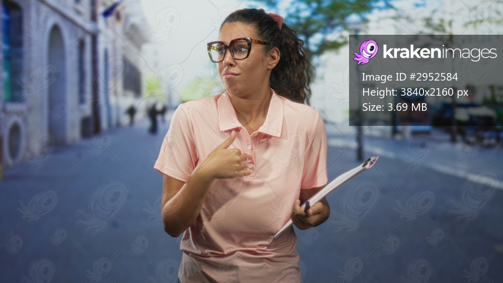 Young woman holding a clipboard touches her chest with one hand in a puzzled gesture while standing on a pedestrian street near buildings; uncertainty. - Kraken Images