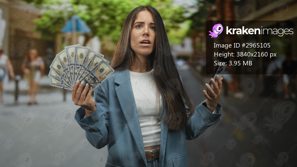 Young woman holding a fan of dollars in one hand while looking at a smartphone with open mouth on a busy street; surprise luck.