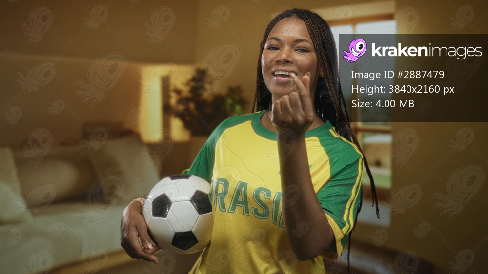 Young woman holding a football and making a finger heart gesture in a building livingroom; pride team spirit.