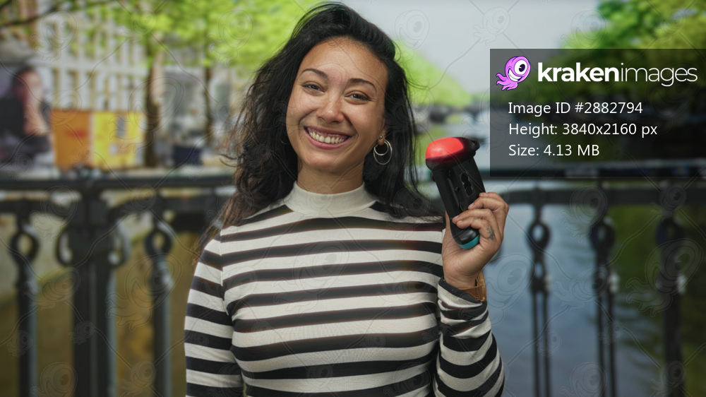 Young woman holding a game controller and smirking on a canal street bridge in amsterdam, outdoors; joy playful travel.