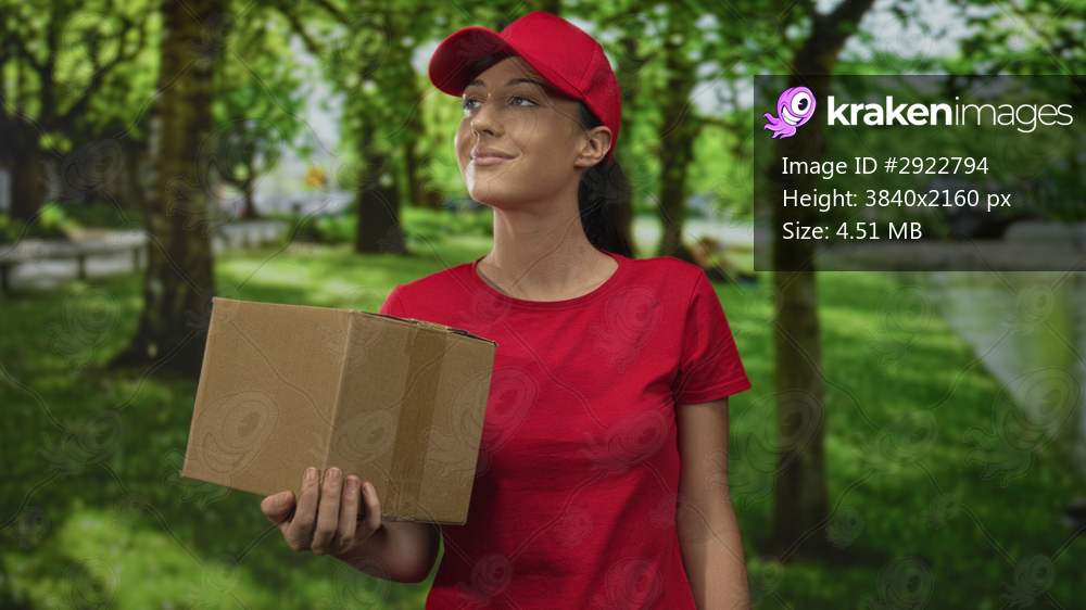 Young woman holding a medium cardboard delivery box on a green park path, smiling and looking aside while standing near trees; friendly service.
