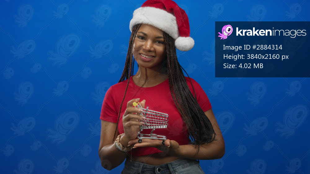 Young woman holding a mini shopping cart with hands while smiling and pointing at it, wearing a santa hat and red crop top in studio; holiday joy.