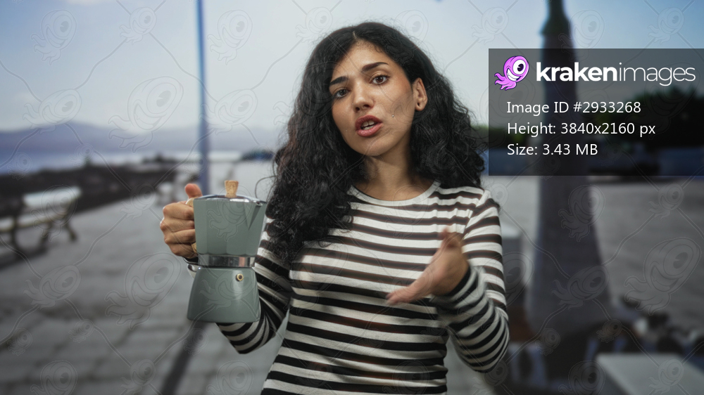 Young woman holding a moka pot with one hand and speaking while gesturing with the other on a seaside street; casual.