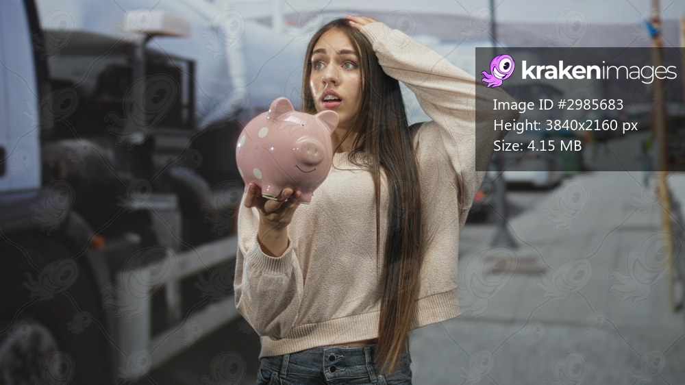 Young woman holding a pink polka dot piggybank in one hand on a street lined with trucks and parked cars; future savings hopeful.