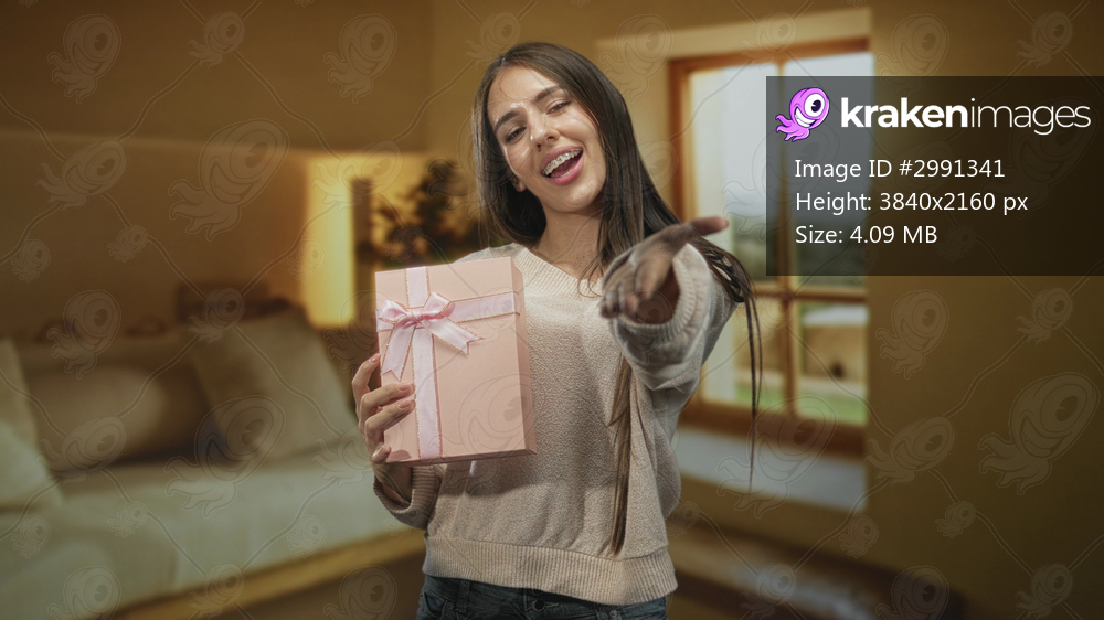 Young woman holding a pink present and blowing a kiss inside a sunlit building, hand to lips gesture; warm joy.