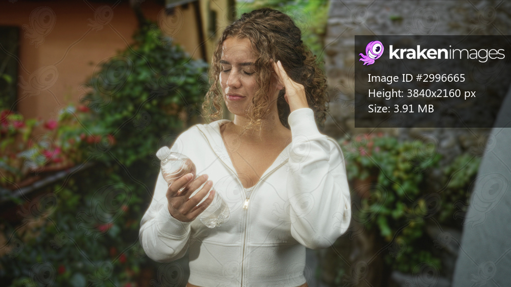 Young woman holding a plastic water bottle, touching temple with hand and grimacing near a stone building and garden; discomfort dehydration.