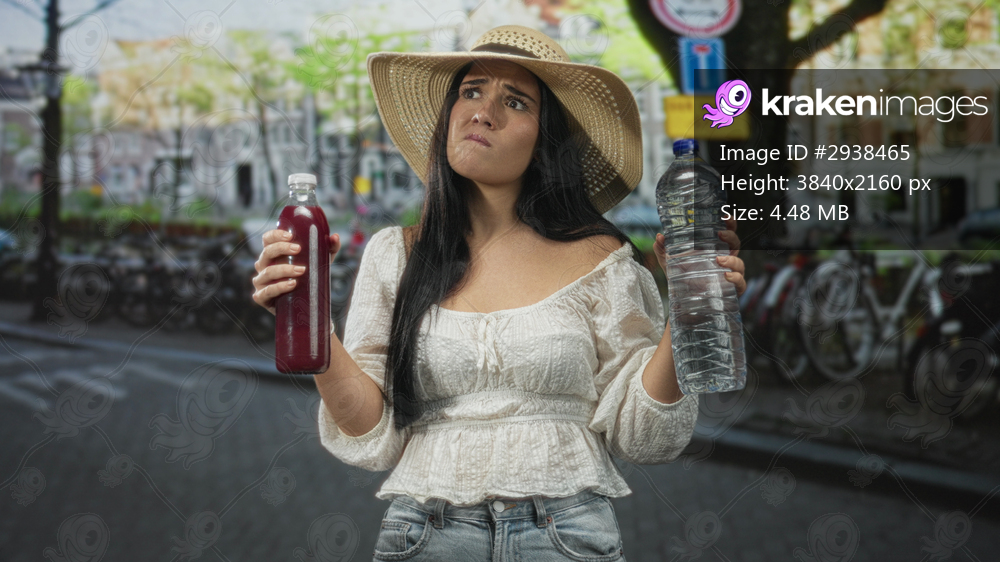 Young woman holding a red juice bottle and a clear water bottle, making a disgusted grimace while comparing them on a city street; choice comparison indecision. - Kraken Images
