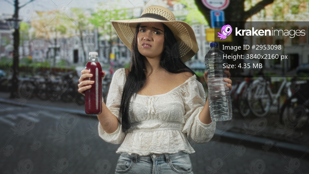 Young woman holding a red juice bottle and a clear water bottle, making a disgusted grimace while comparing them on a city street; choice comparison indecision. - Kraken Images