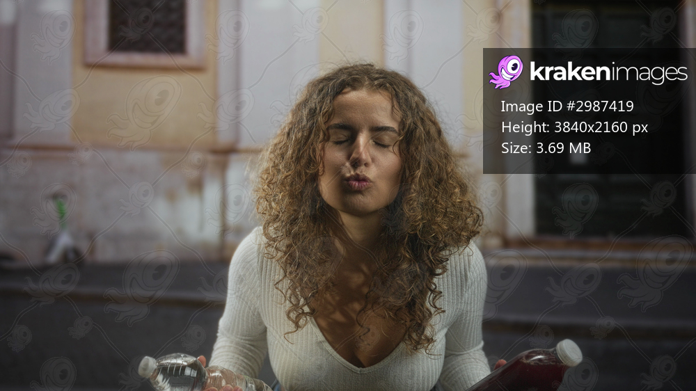Young woman holding a water bottle and a dark juice bottle, showing midriff while tasting and puckering gestures on a street; playful decision.