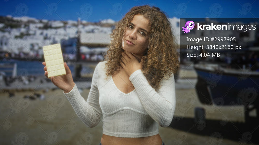 Young woman holding a white chocolate bar while her hand rests on throat in a studio set with seaside village backdrop; savoring pleasure.