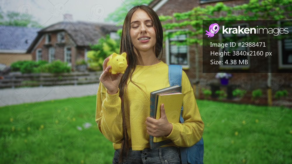 Young woman holding a yellow piggybank and books in front of a brick school building, hand visible holding items; future savings optimism.