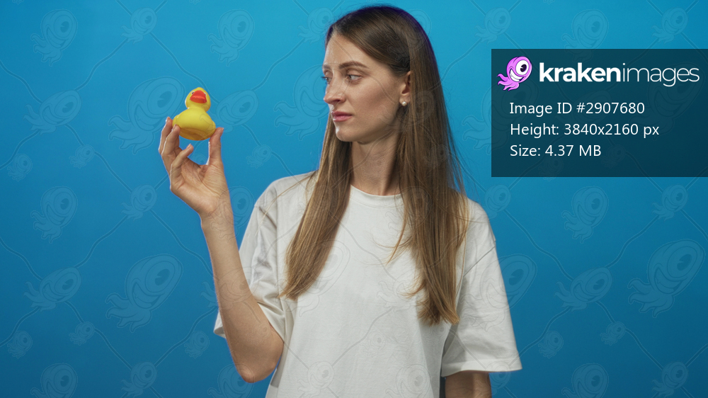 Young woman holding a yellow rubber duck with raised hand and direct gaze in blue studio; skepticism detachment.