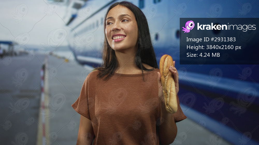 Young woman holding baguette and smiling with raised hand beside moored ship hull at building pier under daylight; travel joy.