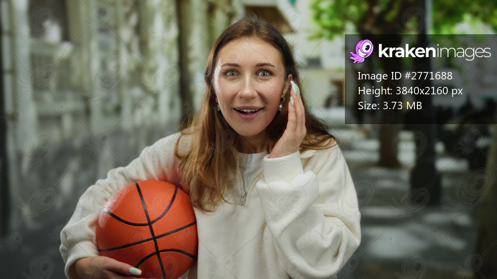 Young woman holding basketball on city street with shocked expression, wearing casual clothing, outdoors, surrounded by urban environment and trees.