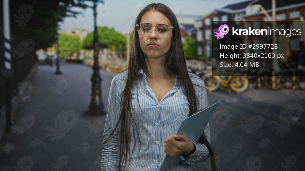 Young woman holding blue clipboard and pen touches forehead for stress while reading documents on a city street; frustration doubt.