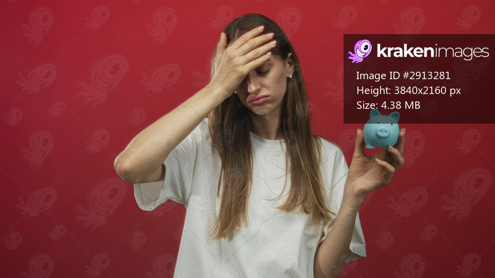 Young woman holding blue piggy bank with hand on forehead and closed eyes in a red studio; financial worry frustration.