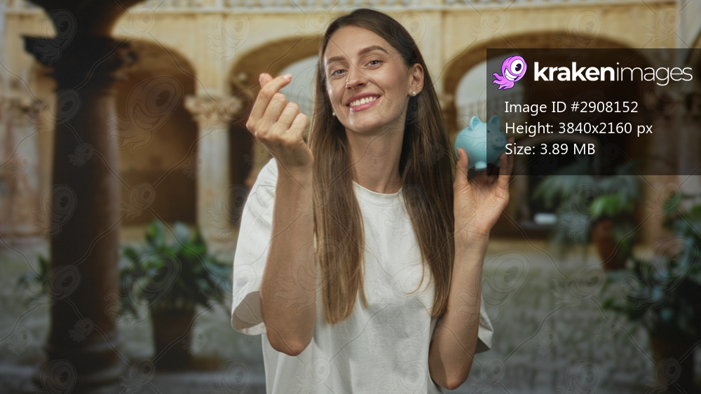 Young woman holding blue piggy bank and pinches fingers in money gesture in building courtyard; savings optimism.