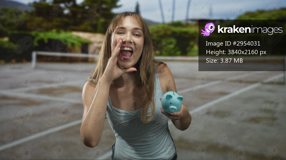 Young woman holding blue piggybank on outdoor tennis court, hand cupped to mouth for shouting gesture while smiling; playful saving.