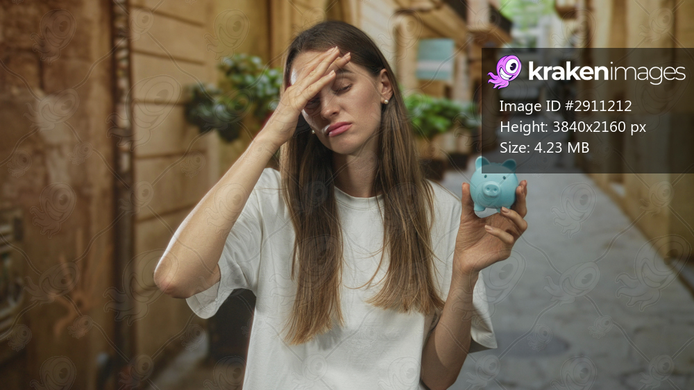 Young woman holding blue piggybank with one hand and pressing forehead with the other on a narrow cobbled street; financial worry.