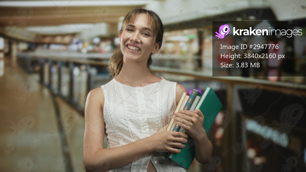 Young woman holding books and a green binder in a shopping mall building, smiling and hugging them with closed eyes; study joy.