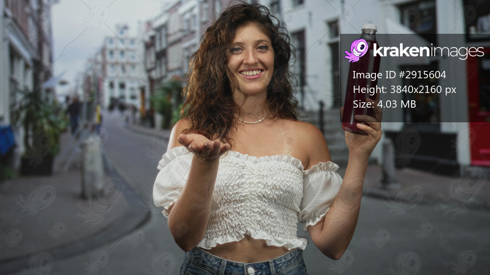 Young woman holding bottle with outstretched hand showing palm on street, smiling and presenting juice; happiness healthy wellness.