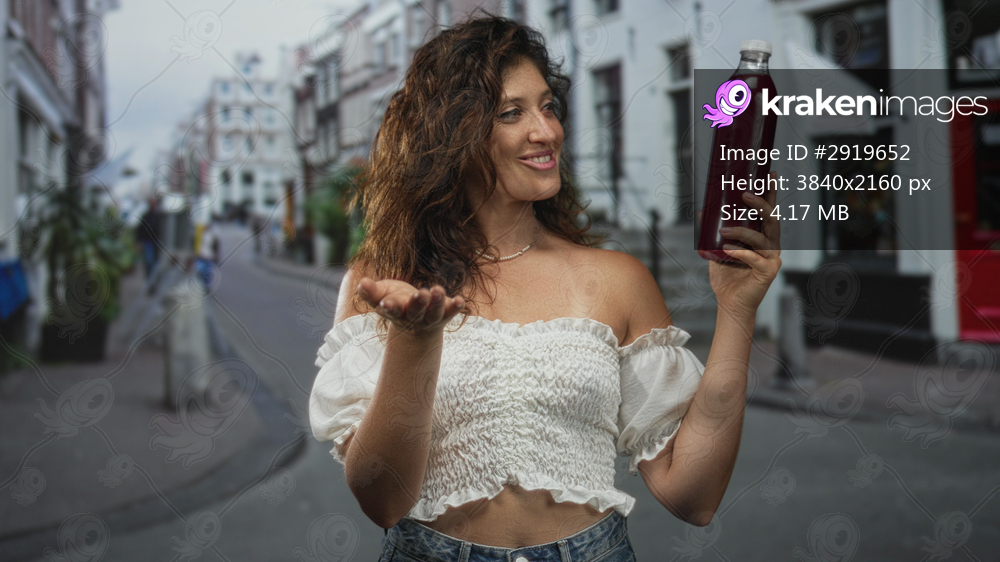 Young woman holding bottle with outstretched hand showing palm on street, smiling and presenting juice; happiness healthy wellness.