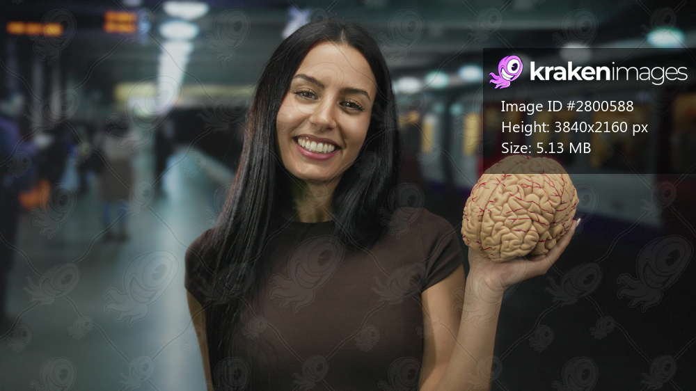 Young woman holding brain model at train station indoors with blurred train in background, exemplifying cognitive curiosity in an urban environment.