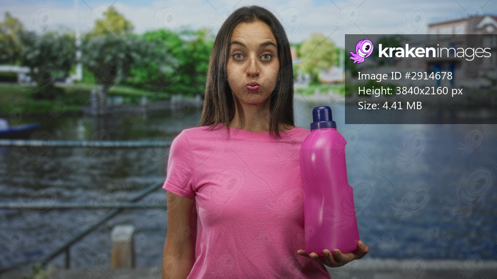 Young woman holding bright pink detergent bottle on amsterdam street by canal railing, smiling with eyes closed; joy reuse.