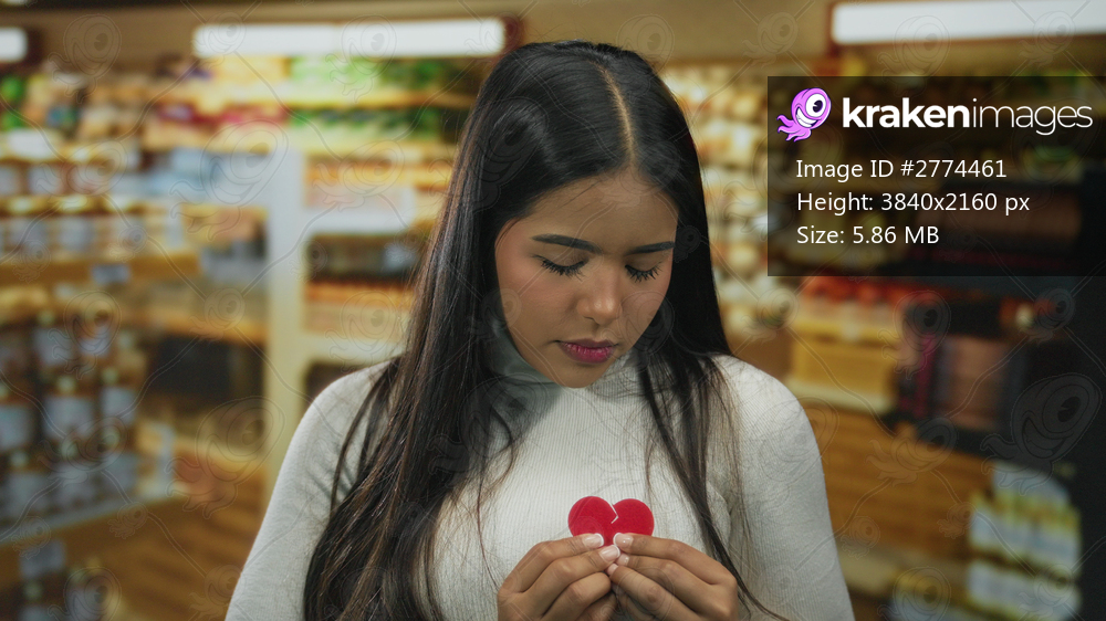 Young woman holding broken heart in supermarket with eyes closed, expressing emotions of sadness and contemplation amidst market shelves.