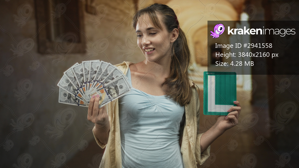 Young woman holding cash fan and green learner plate with hand in old town building; confidence ambition success.