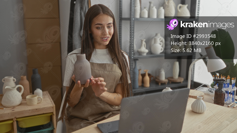 Young woman holding ceramic vase with hands and pointing finger to rim in pottery studio; craftsmanship calm.