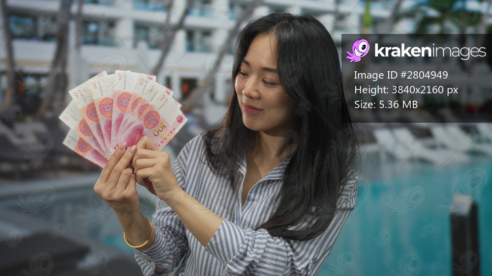 Young woman holding chinese yuan banknotes with excitement at a resort pool, showcasing financial success and adventure in an outdoor hotel setting.
