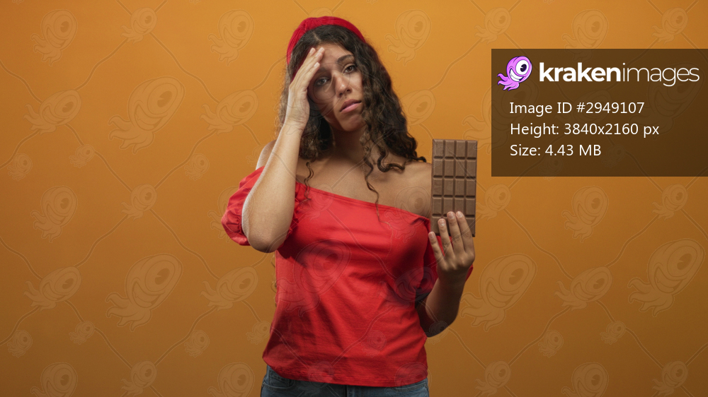 Young woman holding chocolate bar, hand covering face gesture in studio with orange backdrop and red headband; temptation conflict.