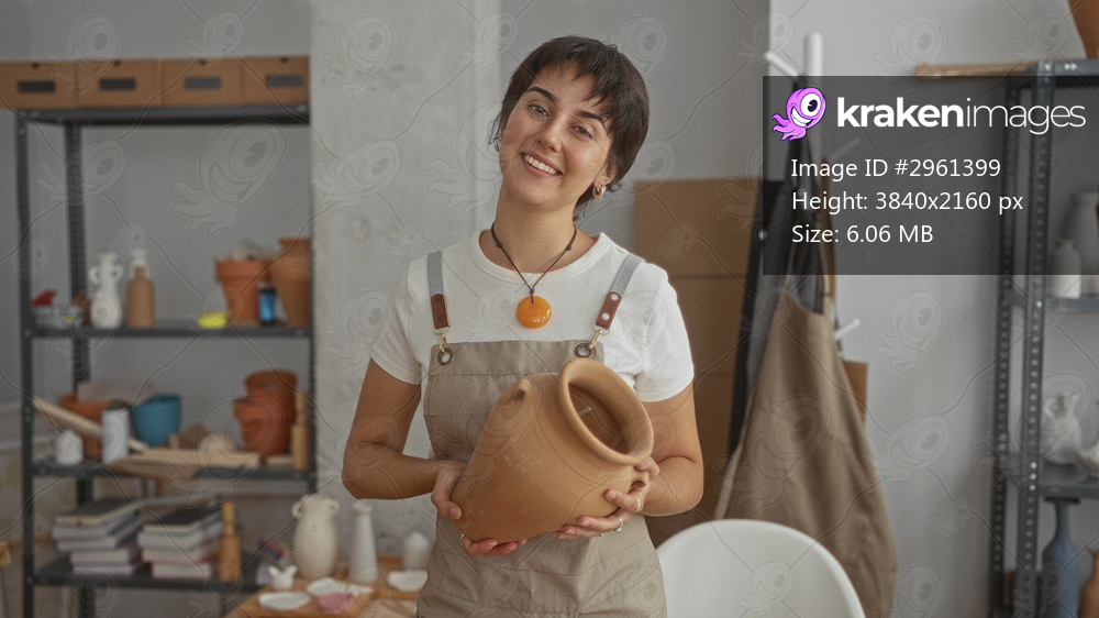 Young woman holding clay pot with hands, smiling and tilting head in a pottery studio; serenity craft.