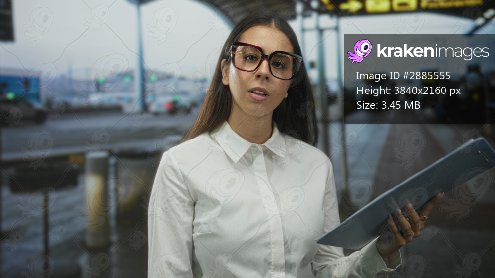 Young woman holding clipboard and reading papers at an airport terminal, wearing glasses and a white shirt while looking at the folder; quiet concentration. - Kraken Images