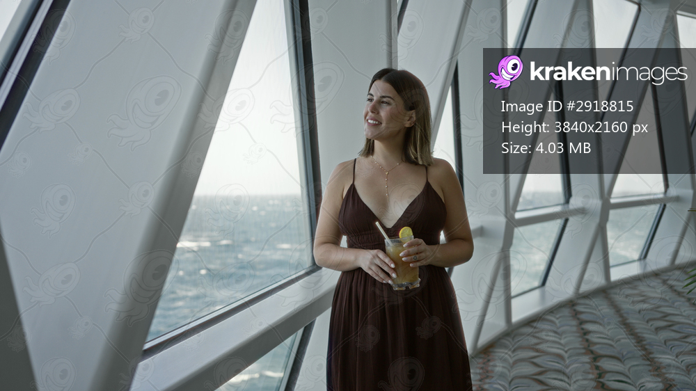 Young woman holding cocktail with cleavage visible at cruise ship deck rail, looking out to sea; relaxation.