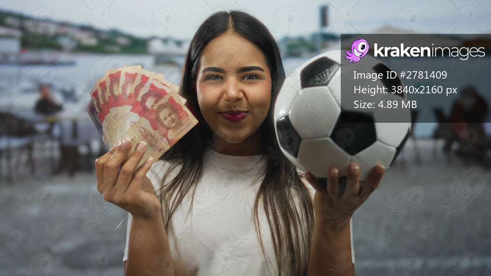 Young woman holding colombian pesos and soccer ball on outdoor restaurant terrace smiling happily with a scenic backdrop.