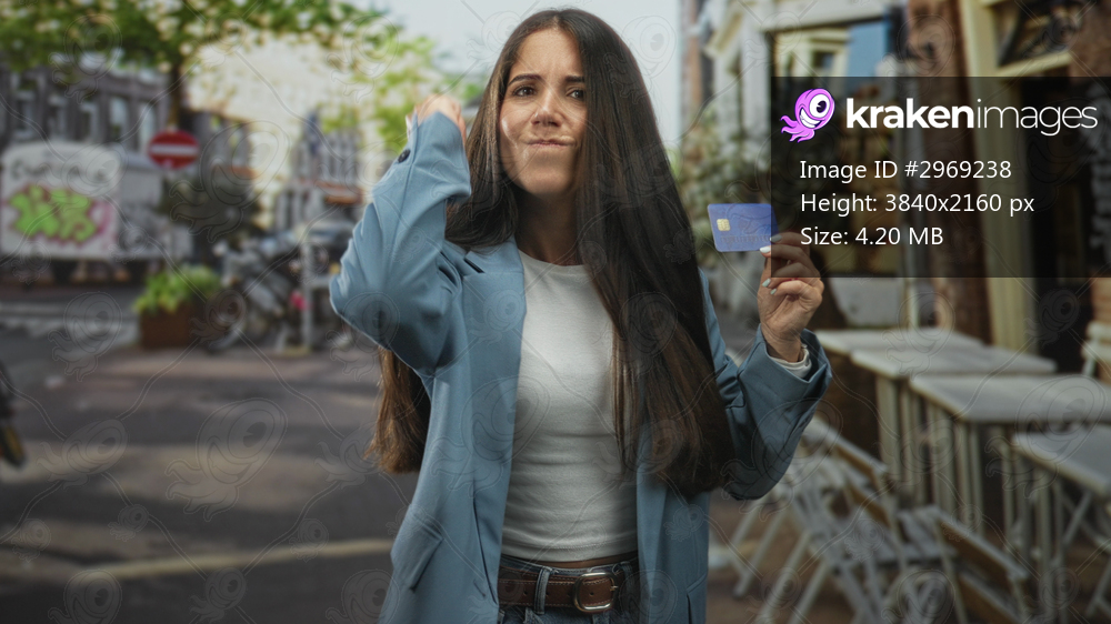 Young woman holding creditcard and pointing with hand on street cafe while showing a blue card to camera; frustration payment dispute.