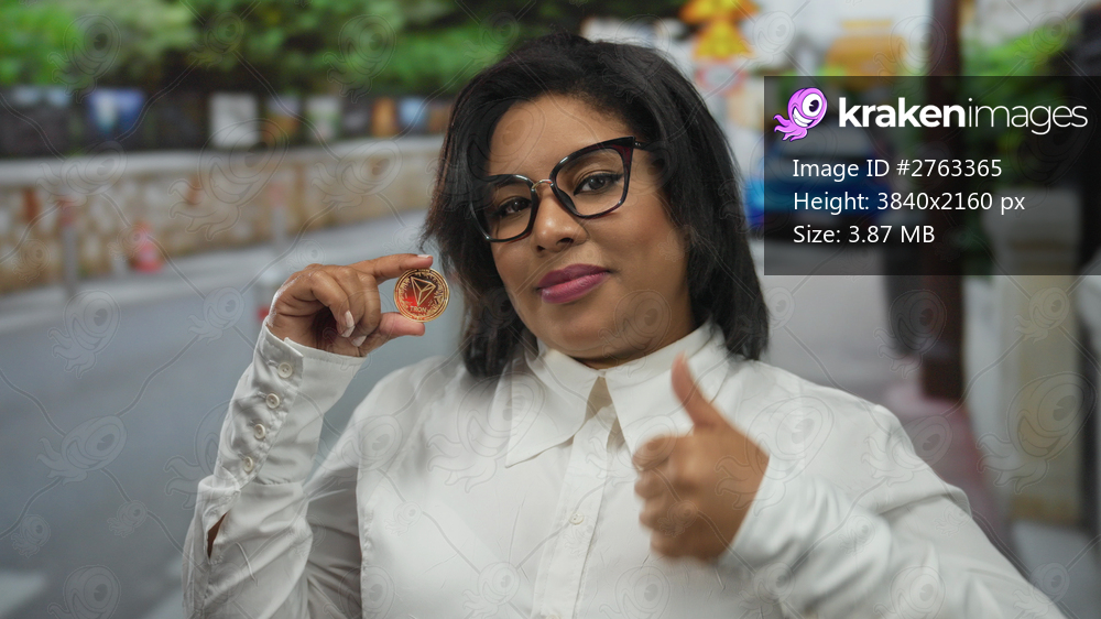 Young woman holding cryptocurrency coin on urban street with confident expression highlighting crypto enthusiasm and modern finance in an outdoor city setting. - Kraken Images