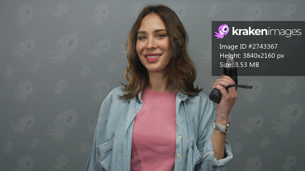 Young woman holding drill over isolated grey background demonstrates confidence with tool in hand